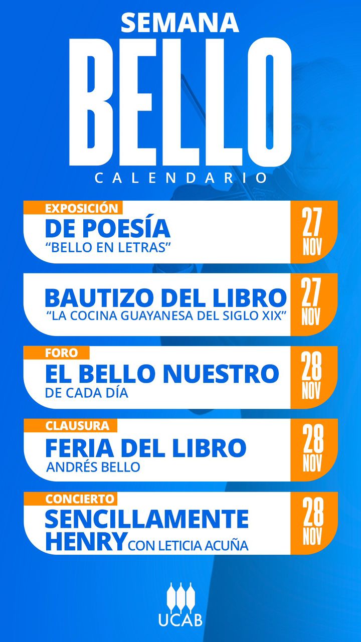 El lunes 24 de noviembre, a las 4:00 p.m., se oficiará una misa en honor a Andrés Bello, en el Lobby del auditorio Constanza Verolini. Para el martes 25, en horas del mediodía, está programada la actividad ‘Almuerza a tu ritmo’ en la Casa del Estudiante. El miércoles 26 a las 4:30 p.m., en la Plaza Central, tendrá lugar Bello Sinfónico, un concierto de la Orquesta Sinfónica de Ciudad Guayana.