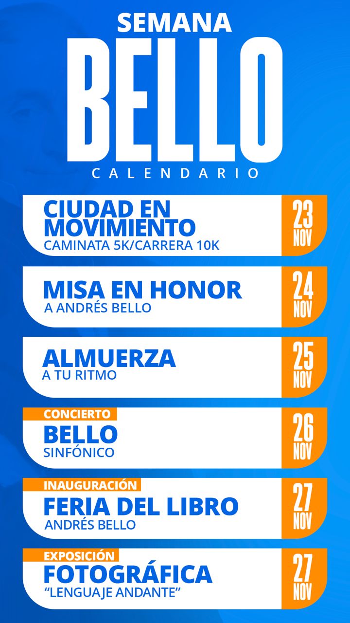 La celebración de la Semana Bello, en conmemoración de su natalicio, comenzará el domingo 23 de noviembre con el evento deportivo Ciudad en Movimiento, en su cuarta edición, a las 6:00 a.m., con una caminata 5K y carrera 10K.