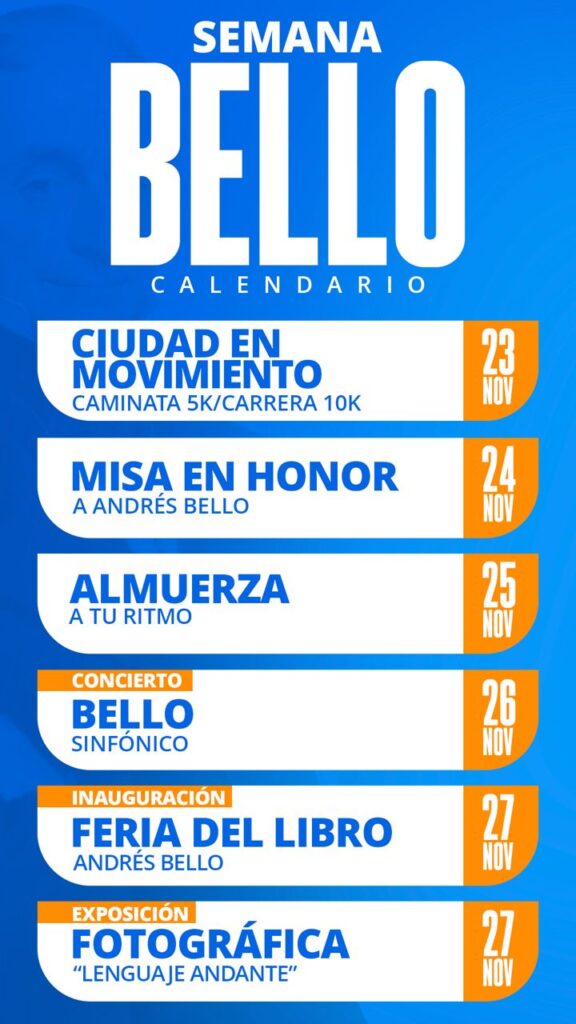 Durante la semana del 23 al 28 de noviembre, se desarrollarán eventos abiertos a la comunidad universitaria y al público en general, con el propósito de promover el pensamiento de Andrés Bello y honrar su legado en la formación integral, la responsabilidad social y la búsqueda constante del saber.