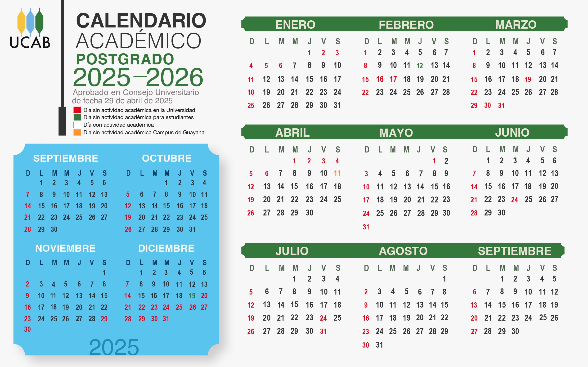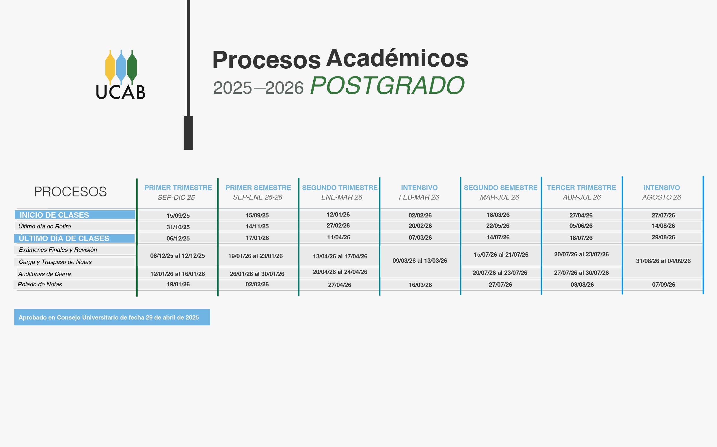Calendario Académico PREGRADO Descargar en PDF POSTGRADO Descargar en PDFAnteriores2024-2025 2023-2024 2022-2023 2021-2022 2020-2021 2019-2020 2018-2019 2017-2018 2016-2017 2015-2016 2014-2015 2013-2014 2012-2013