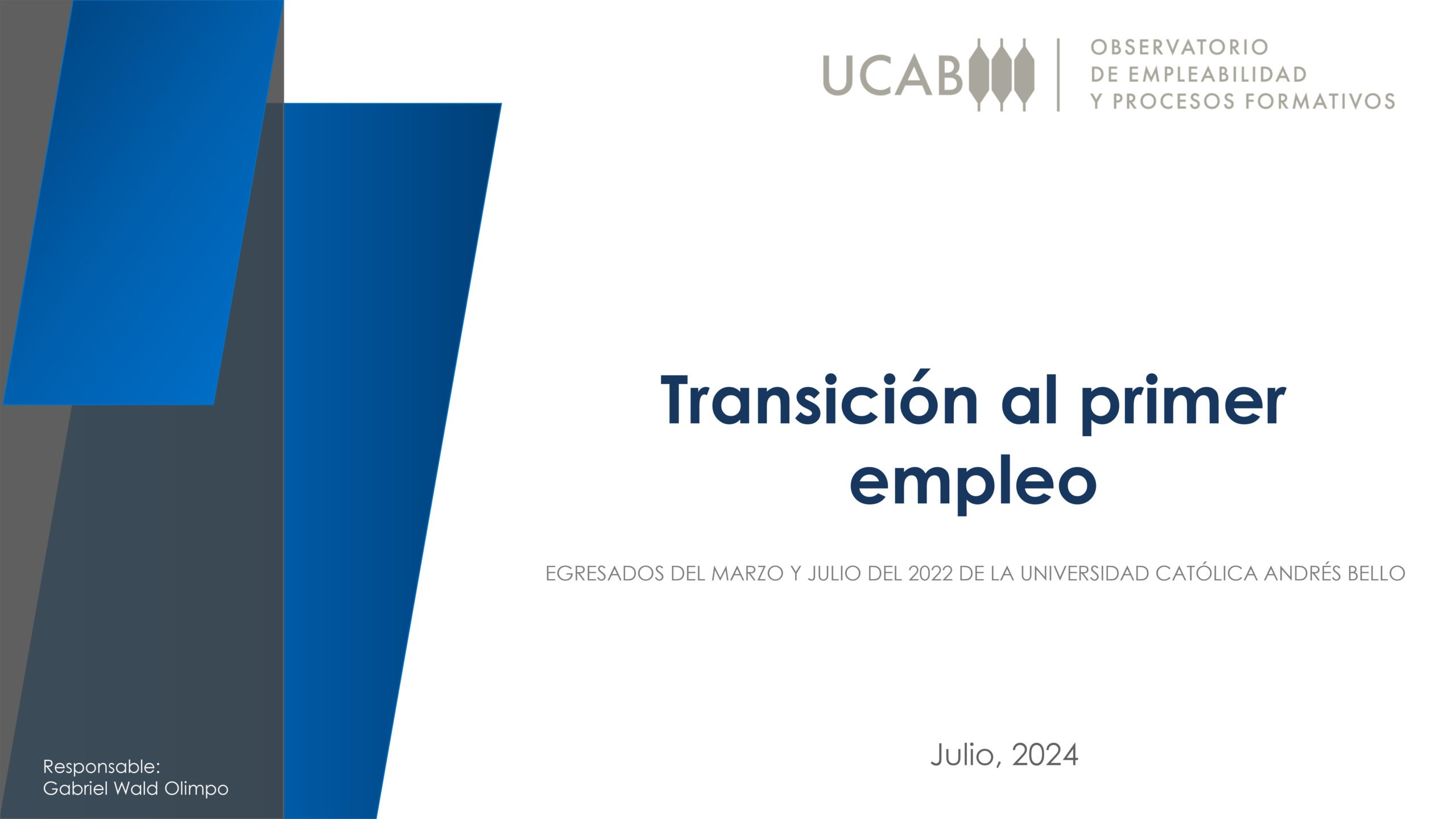 El objetivo de la investigación fue caracterizar la transición al primer empleo de los egresados en el 2013 de todas las facultades de la Universidad Católica Andrés Bello.